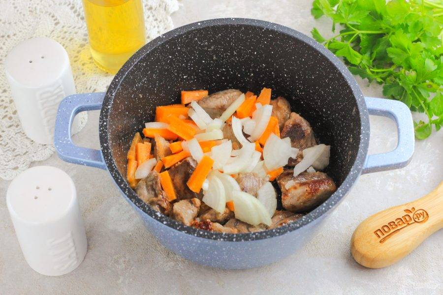 Нарежьте очищенную морковь брусочками, а лук — полукольцами и добавьте в емкость. Обжарьте 3-5 минут.