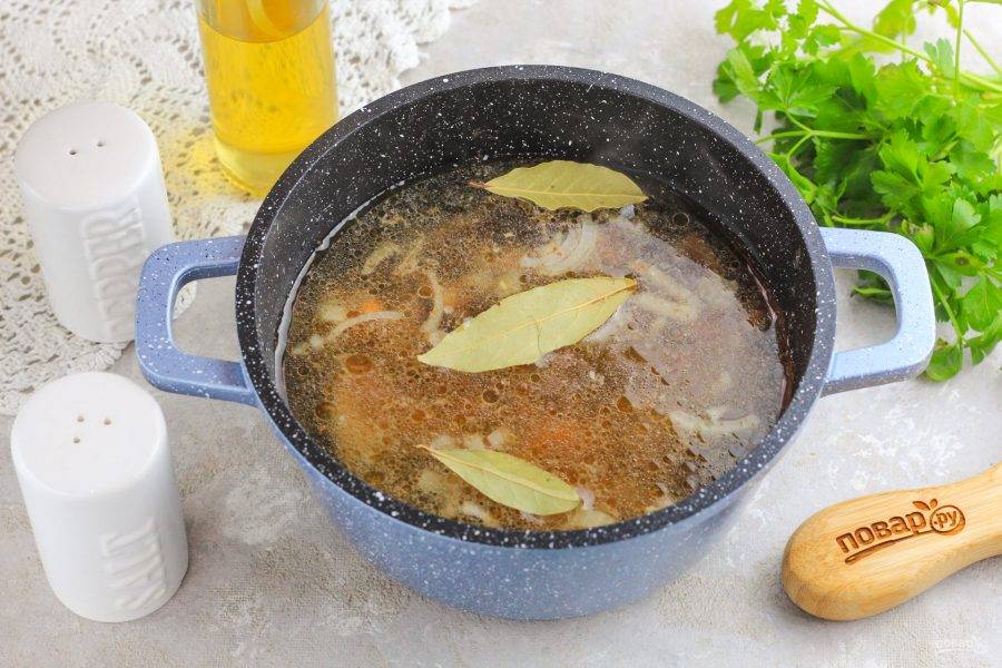 Влейте кипяток и всыпьте лавровые листья. Доведите до кипения и убавьте нагрев. Отварите в течение 45 минут на умеренном нагреве, прикрыв емкость крышкой.