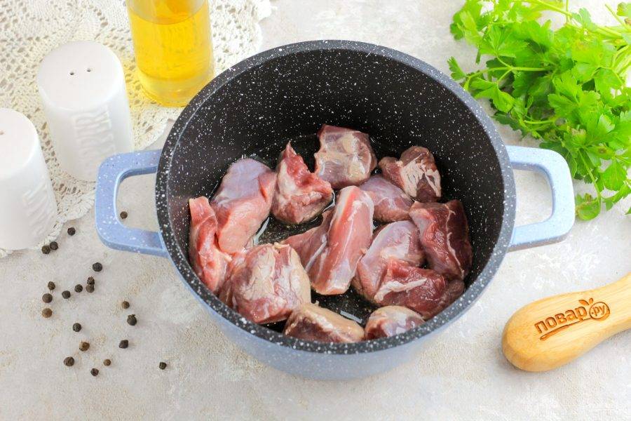 Прогрейте в казане или кастрюле с антипригарным дном растительное масло или смалец, выложите нарезанную говядину и обжарьте 8-10 минут до румяности.