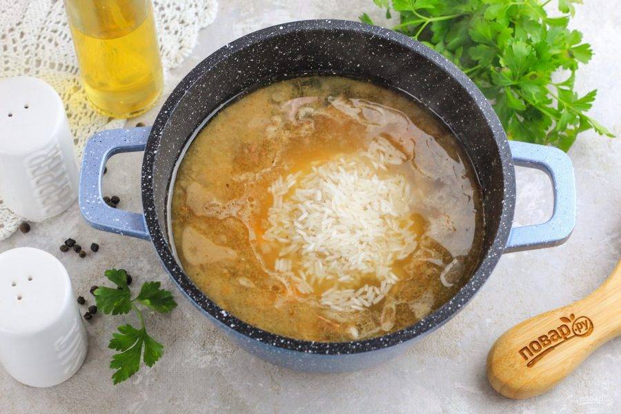 Затем промойте рис и всыпьте его в емкость. Во время варки мяса жидкости станет меньше, но она должна покрывать рис на несколько сантиметров. Крупа набухнет в процессе варки и вберет в себя весь бульон.
