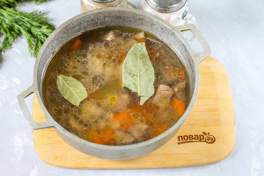 Затем влейте воду, добавьте соль и лавровые листья, отварите содержимое казана примерно 15 минут.