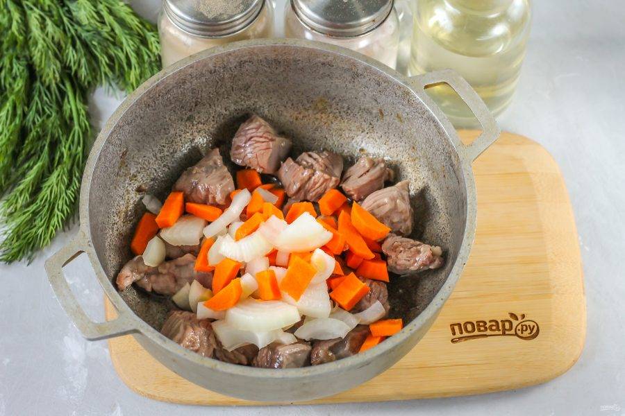 Очистите от кожуры лук и морковь, промойте в воде. Нарежьте брусочками морковь, а лук — полукольцами. Добавьте в казан и обжарьте все вместе еще 3-5 минут.