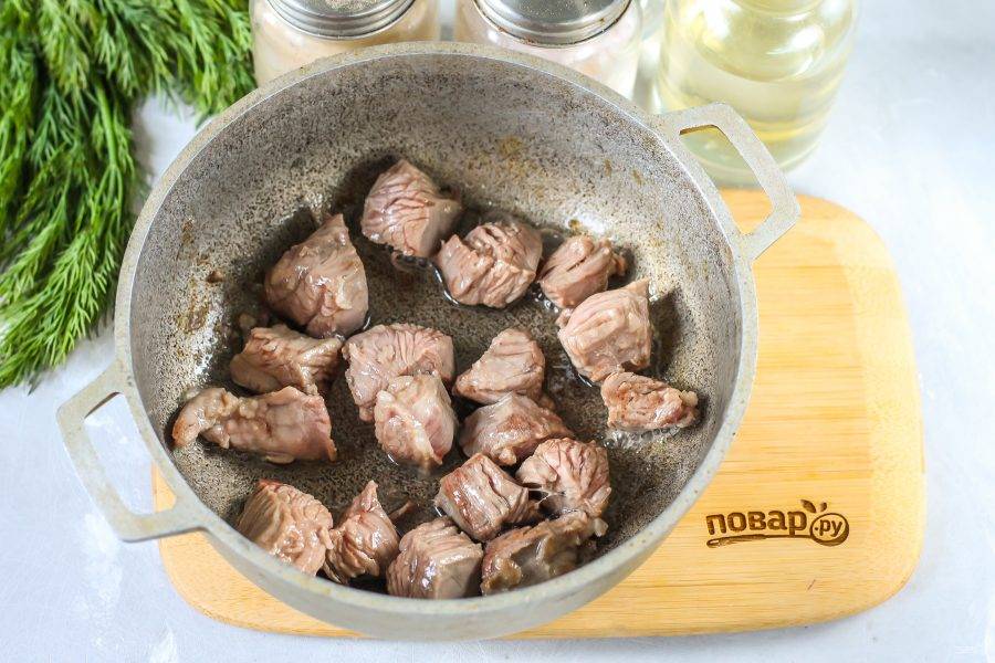 Баранину промойте в воде, срежьте жилы и пленки, нарежьте мясо на кусочки. Прогрейте в казане на плите растительное масло либо протопите курдючное сало, если оно есть в наличии. Выложите в жир кусочки мяса и обжарьте примерно 5-6 минут на умеренном нагреве до румяности.