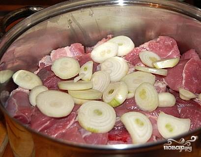 Лук нарезать полукольцами. На дно небольшой кастрюли укложить половину лука, затем мясо и оставшийся лук. Залить 2-3 стаканами чистой холодной воды и поставить на огонь. Дать закипеть, снять пену, варить на медленном огне под закрытой крышкой минут 40-50.