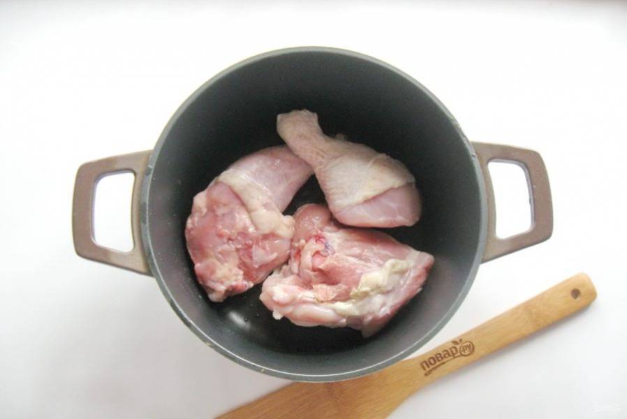 Любые мясистые части курицы помойте, обсушите и выложите в казан с толстым дном.