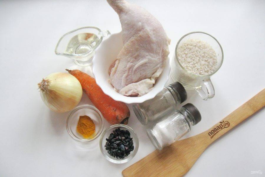 Подготовьте все ингредиенты для приготовления плова с курицей.