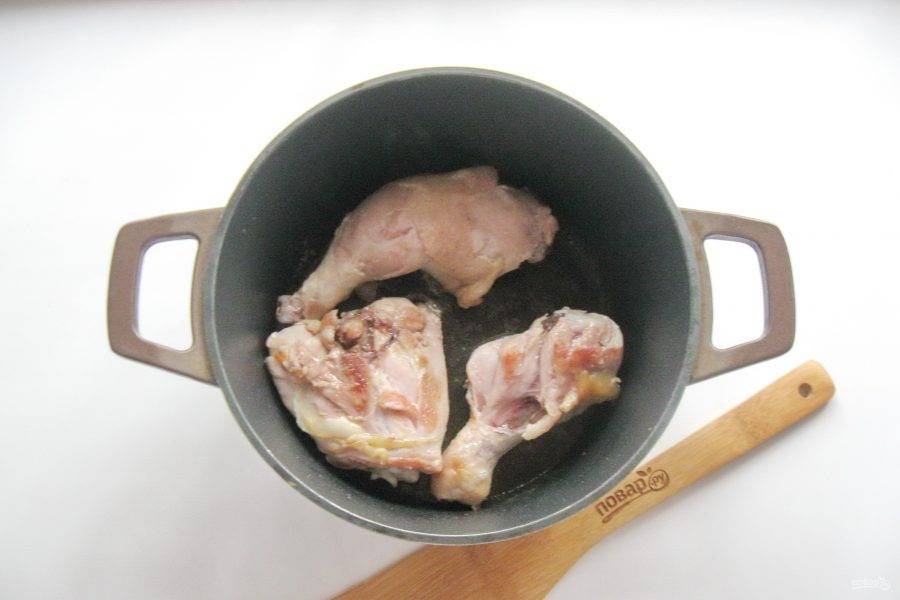 Налейте немного подсолнечного масла и слегка обжарьте курицу в казане.