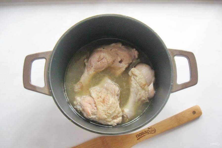 Достаньте тушеную курицу и отделите мясо от костей и шкурки. Верните обратно в казан чистую мякоть.