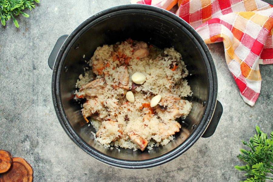 Рис тщательно промойте в нескольких водах, пока она не станет чистой. Добавьте рис в чашу мультиварки. Чеснок почистите и целиком выложите на рис.