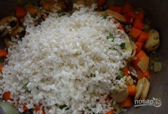 6. В стакане воды или бульона разведите соль и специи, вылейте к рису, затем добавьте жидкости столько, чтобы она еле-еле покрывала все ингредиенты. Тушите в открытом казанке около 20 минут на минимальном огне.