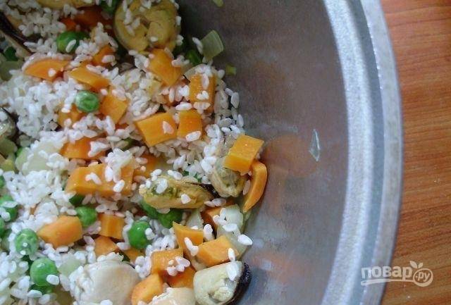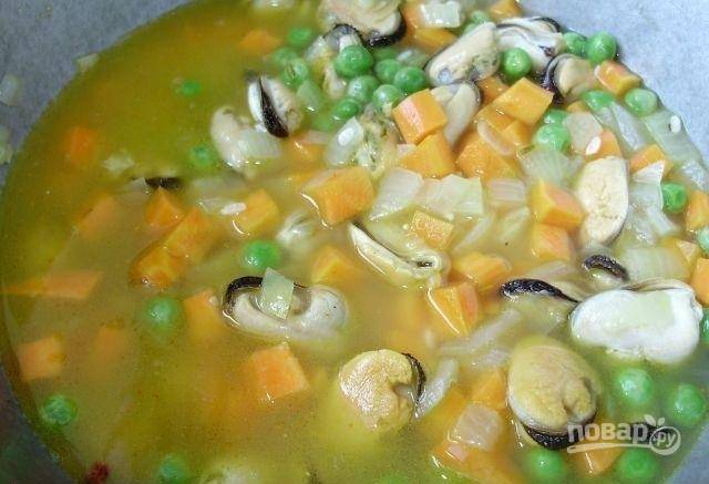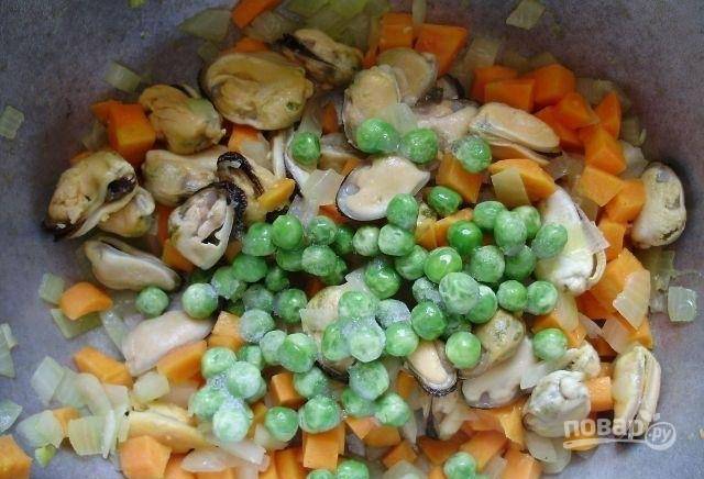 3. Выложите к моркови и луку замороженный зеленый горошек (можно свежий), а также мидии, тушите несколько минут.