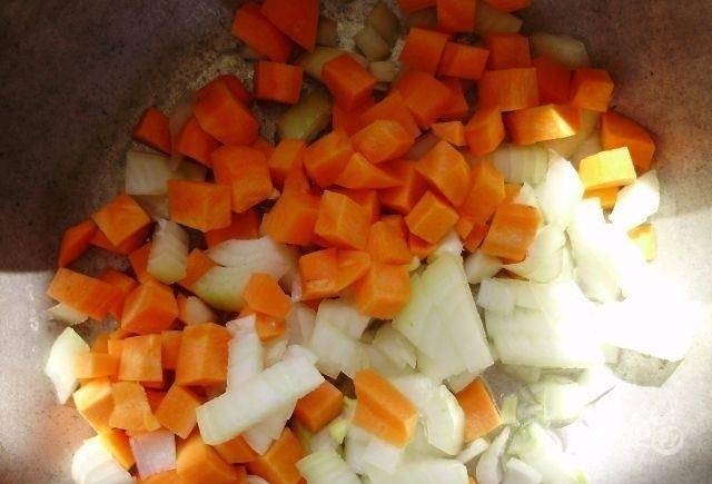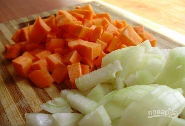 1. Очистите морковь и лук, нарежьте овощи небольшими кубиками (предпочтительнее одного размера).
