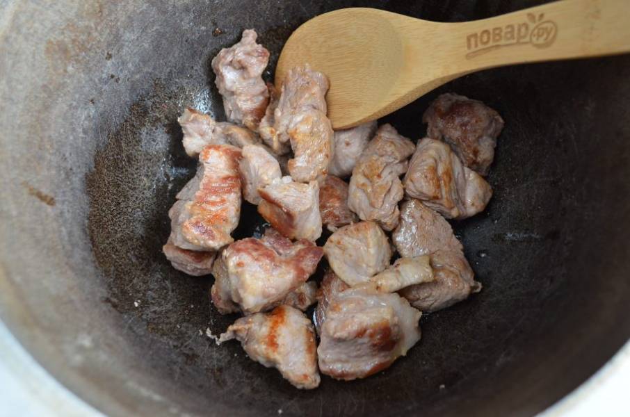 3. На растительном масле обжарьте мясо до образования корочки, огонь должен быть сильным, чтобы мясо не тушилось, а жарилось. Крышкой закрывать сковороду не нужно. Солить не нужно пока. После обжарки переложите мясо в посудину, в которой планируете готовить плов, подойдет стекло огнеупорное или чугун, можно взять керамическую кастрюлю.