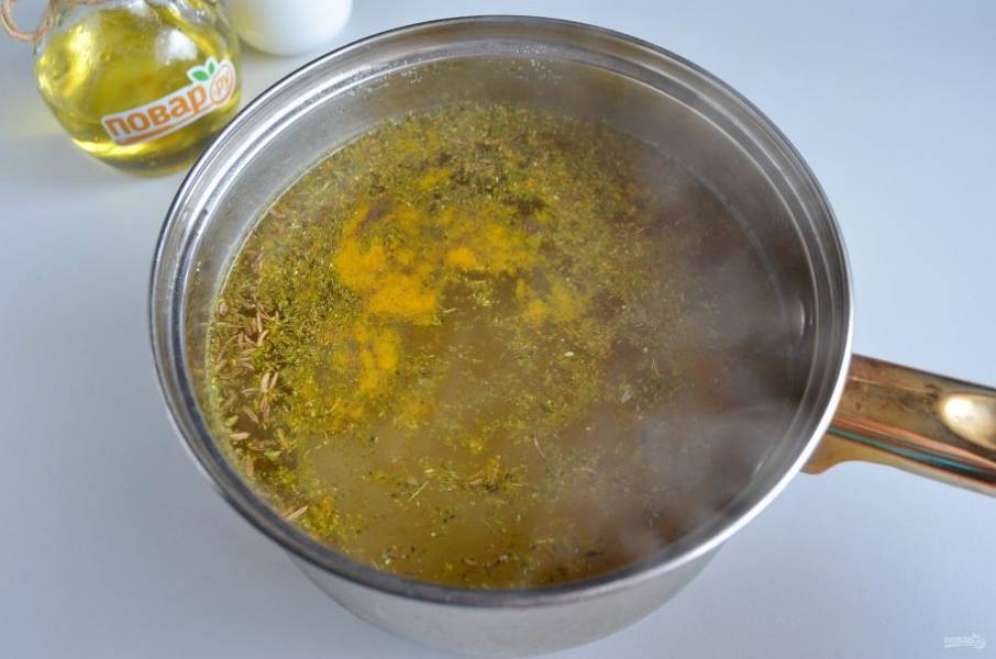 6. Вскипятите воду, добавьте специи и соль. Снимите с огня, перемешайте хорошо, чтобы соль растворилась. Включите духовку на максимум, пусть прогревается.