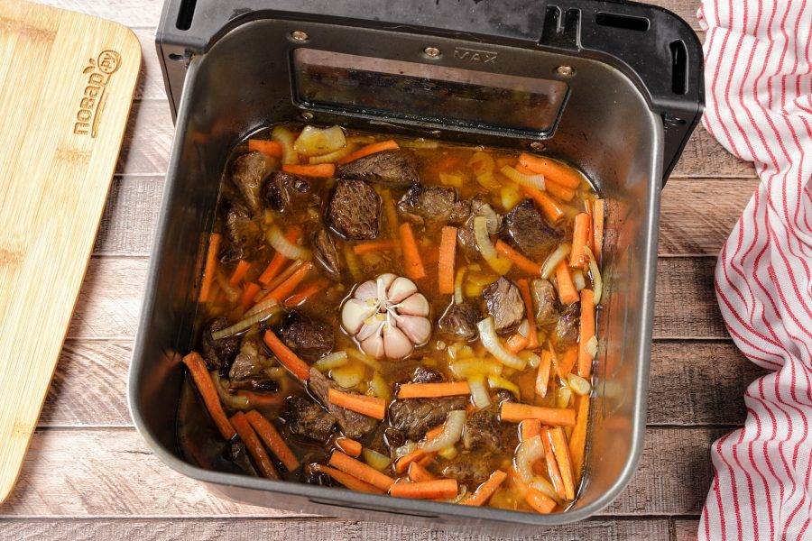 Чеснок очистите от верхней шелухи, хорошо промойте и добавьте к мясу с овощами.