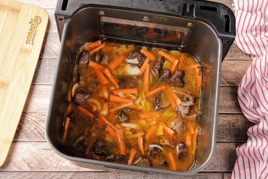 Добавьте кипяток. Вода должна превысить уровень риса не более, чем на 2-2,5 см., иначе получится каша. Установите температуру 200 градусов и готовьте около часа или до готовности риса. Здесь есть ньюанс, примерно каждые 15-20 минут плов нужно аккуратно перемешивать.
