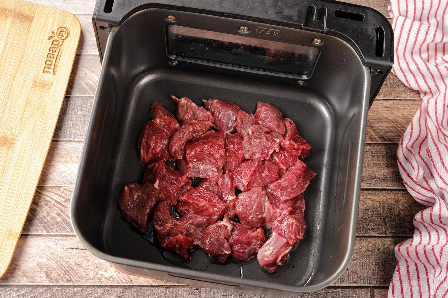 В чашу аэрогриля налейте 1-2 ст.л. растительного масла и выложите нарезанное мясо.