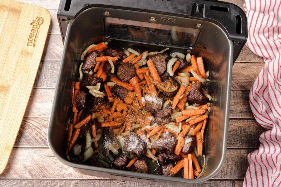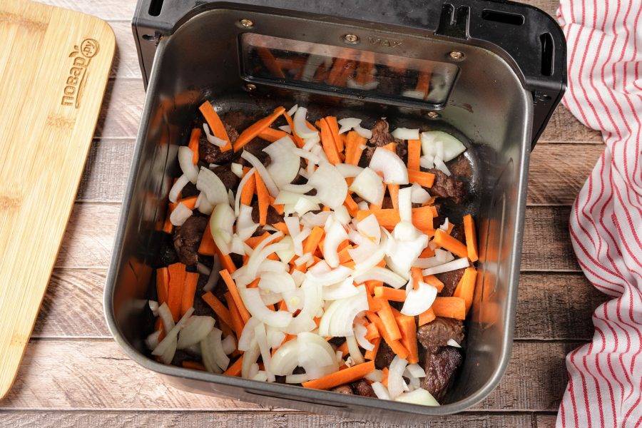 Затем добавьте нарезанную соломкой морковь и нарезанный перьями лук. Влейте оставшееся масло и продолжайте готовить при такой же температуре около 5 минут. Пару раз мясо с овощами перемешайте.