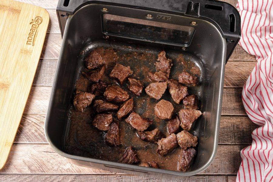 Подрумяньте мясо в течение 15 минут при температуре 200 градусов. Два-три раза необходимо перемешать, чтобы мясо не подсушить.