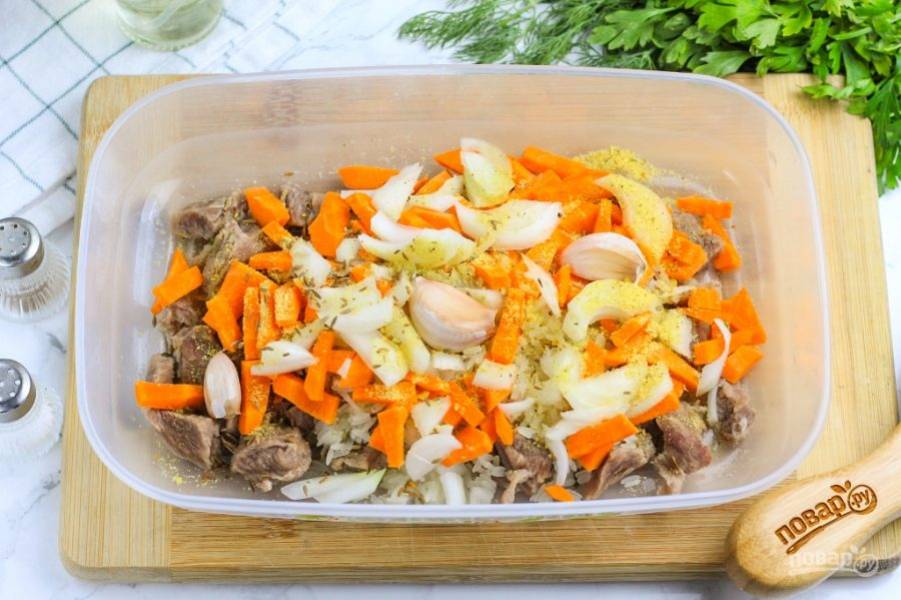 Промойте зубчики чеснока, но не очищайте их. Добавьте в емкость вместе с приправой, зирой и т.д. Аккуратно все перемешайте.