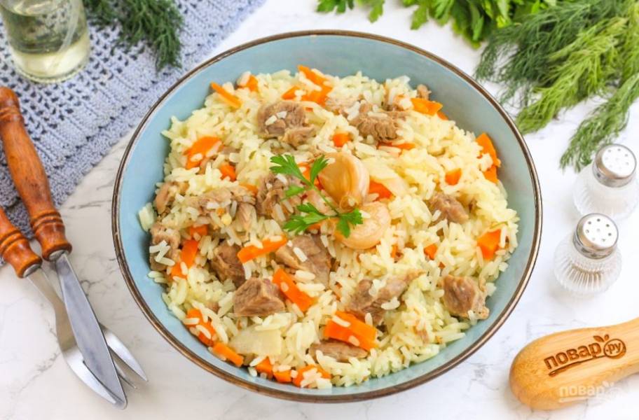 Ароматный плов готов — выложите его в тарелки или пиалы и позовите к столу родных, друзей. Приятного вам аппетита!