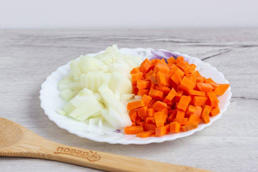 Лук и морковь нарежьте. Обжарьте в сковороде после картофеля.