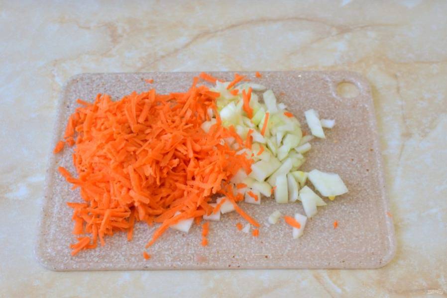В это время очистите овощи. Лук мелко нарежьте, а морковь потрите на терке.