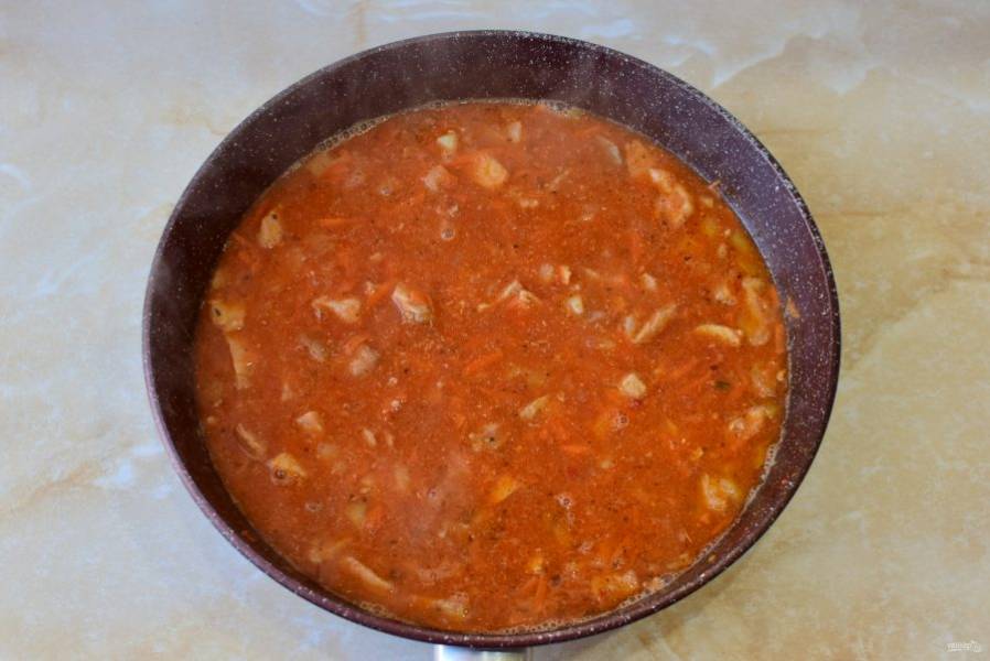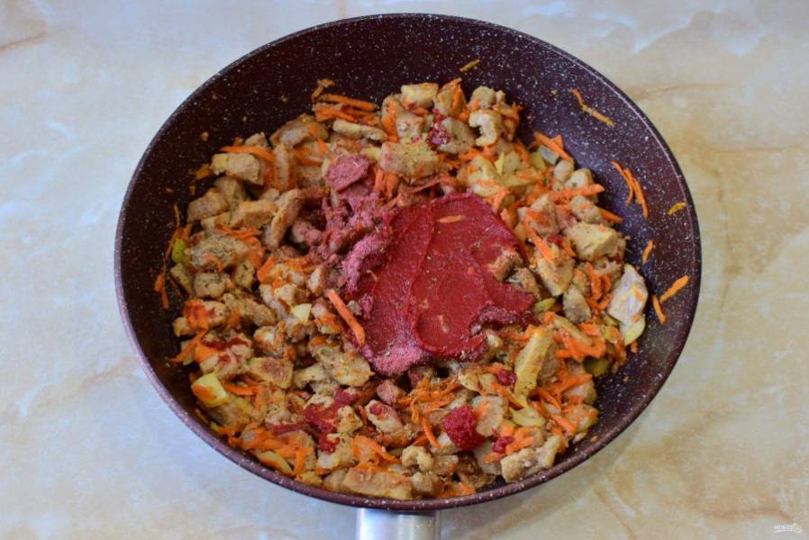 Затем добавьте томатную пасту. По вкусу подсыпьте соль и специи. Перемешайте.