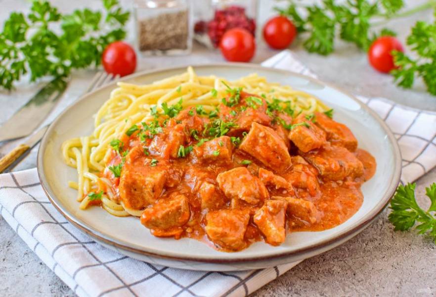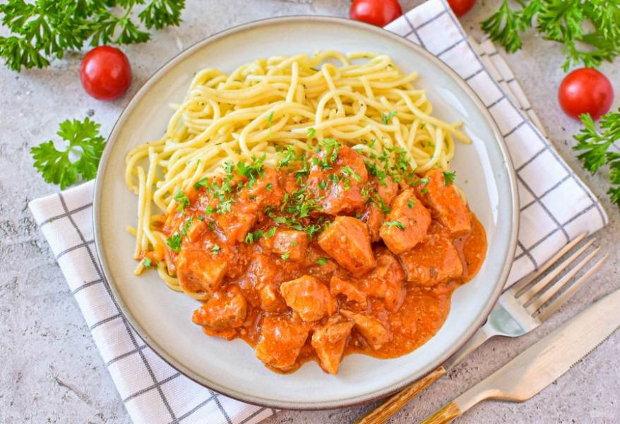 Простое, вкусное и достаточно универсальное блюдо для обеда или ужина. К такому поливу отлично подойдет любой гарнир — макароны, рис или картофельное пюре. Дополните готовое блюдо свежими овощами.