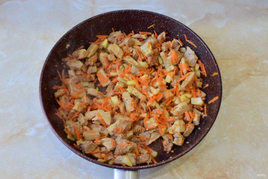 Мясо нарежьте небольшими кусочками и обжарьте 5-7 минут на небольшом огне, с добавлением растительного масла.