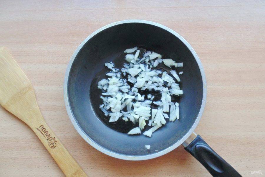Репчатый лук мелко нарежьте и выложите в сковороду с растительным маслом.