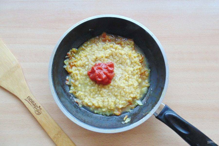 Выложите в сковороду разваренную чечевицу и томатную пасту.