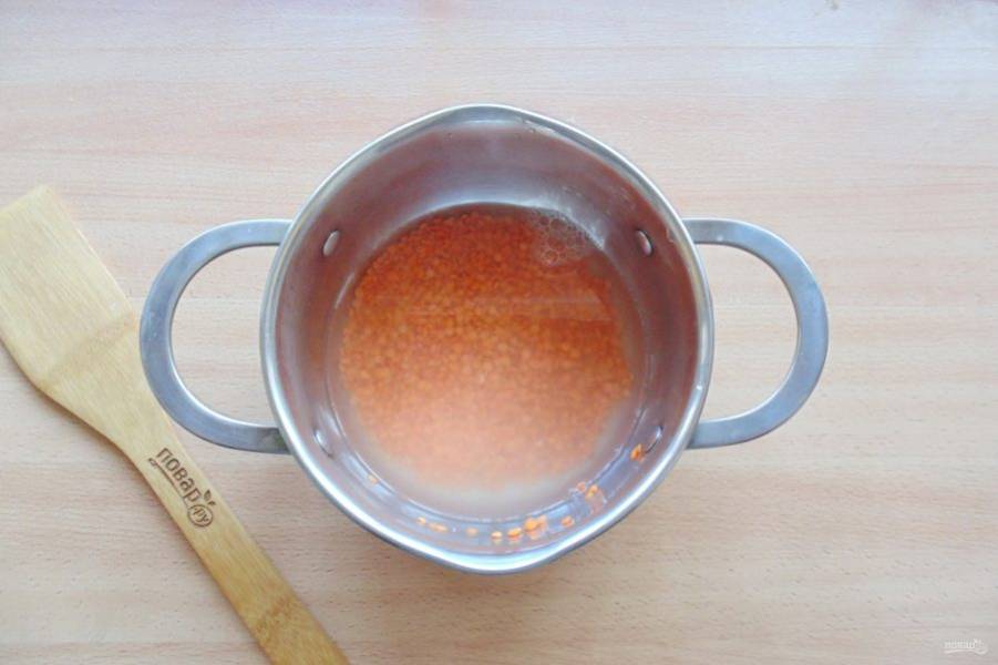 Чечевицу помойте и выложите в кастрюлю, залейте водой. Варите минут 15-20, пока чечевица хорошо не разварится.