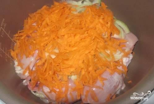 Теперь очередь моркови. Чистим, моем и натираем на крупной терке. Выкладываем морковь в компанию к курице и луку. Туда же отправляем измельченные дольки чеснока. Солим.