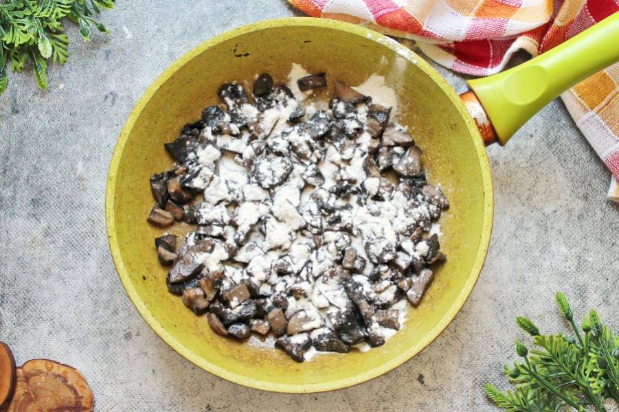 Обжаривайте грибы на среднем огне до полного выпаривания жидкости, примерно 5-7 минут, перемешивая. Грибы посыпьте мукой и перемешайте. Обжаривайте все еще одну минуту, перемешивая.