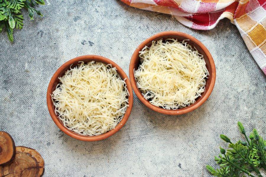 Твердый сыр натрите на средней терке. Разложите подосиновики со сметаной в формочки и посыпьте тертым сыром.