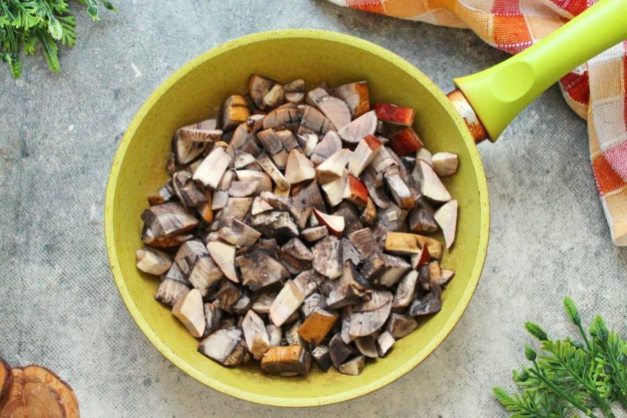 Подосиновики почистите от грязи и мусора, уберите червивые и сполосните. Грибы порежьте на дольки. В сковороде разогрейте растительное масло и добавьте грибы.
