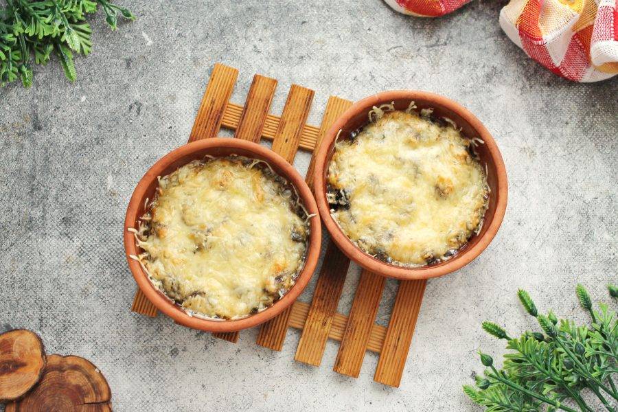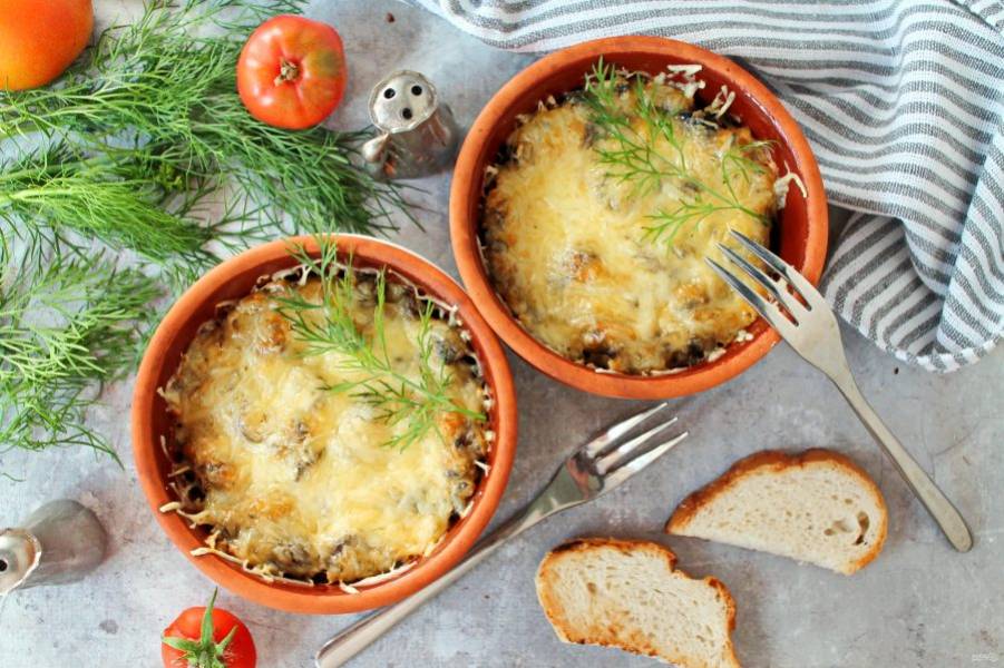 Формочки поставьте в горячую духовку и запекайте при температуре 180 градусов в течение 15-20 минут, до румяной корочки. Выньте формочки с грибами из духовки и сразу подавайте на стол.