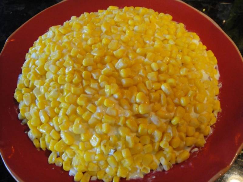 5. Выложите консервированную кукурузу, прижмите ее ложкой.