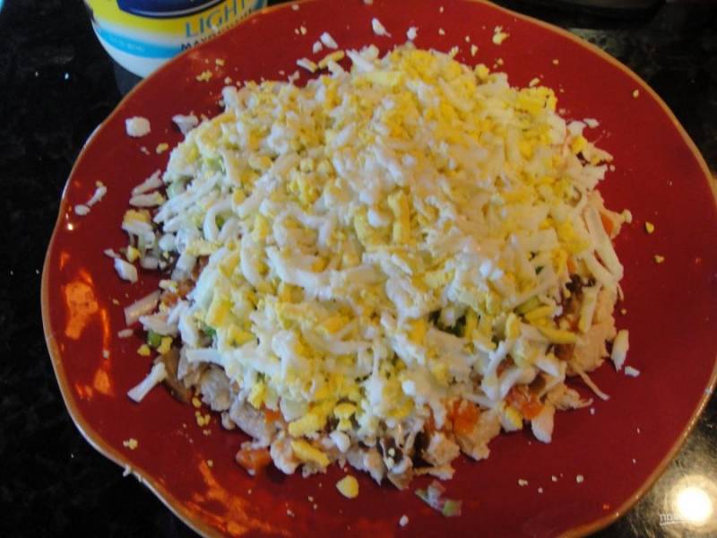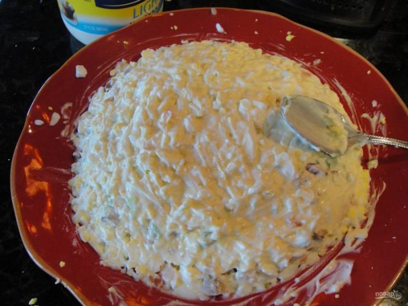 3. Измельчите зеленый лук (часть оставьте для украшения) и выложите поверх грибов, смажьте майонезом. На крупной терке натрите яйца поверх майонезного слоя.