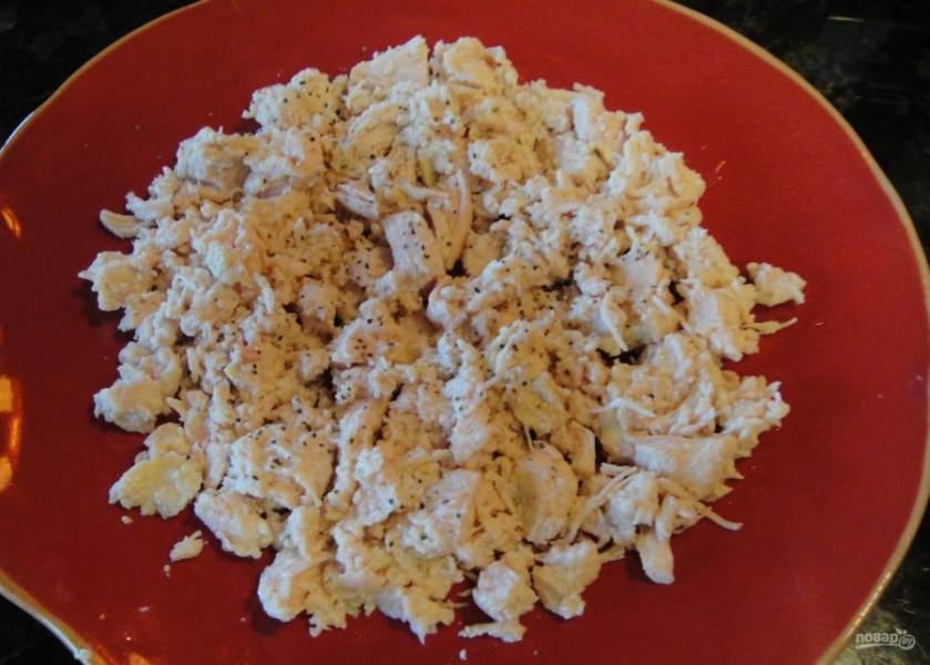 1. Нарежьте отварную курицу кусочками и уложите нижним слоем, поперчите и посолите.
