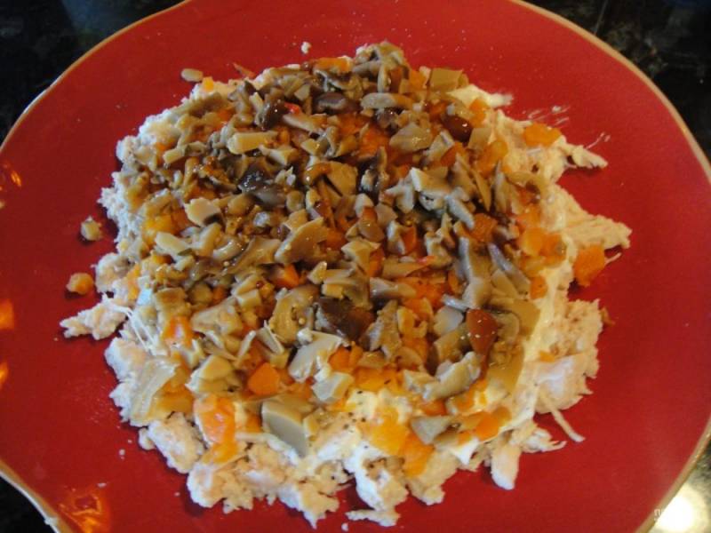 2. Отварите морковь и яйца, затем остудите и очистите, нарежьте небольшими кубиками только морковь. Уложите поверх курицы морковь, посолите, затем смажьте тонким слоем майонеза. Нарежьте кусочками маринованные грибы и выложите их поверх майонеза.