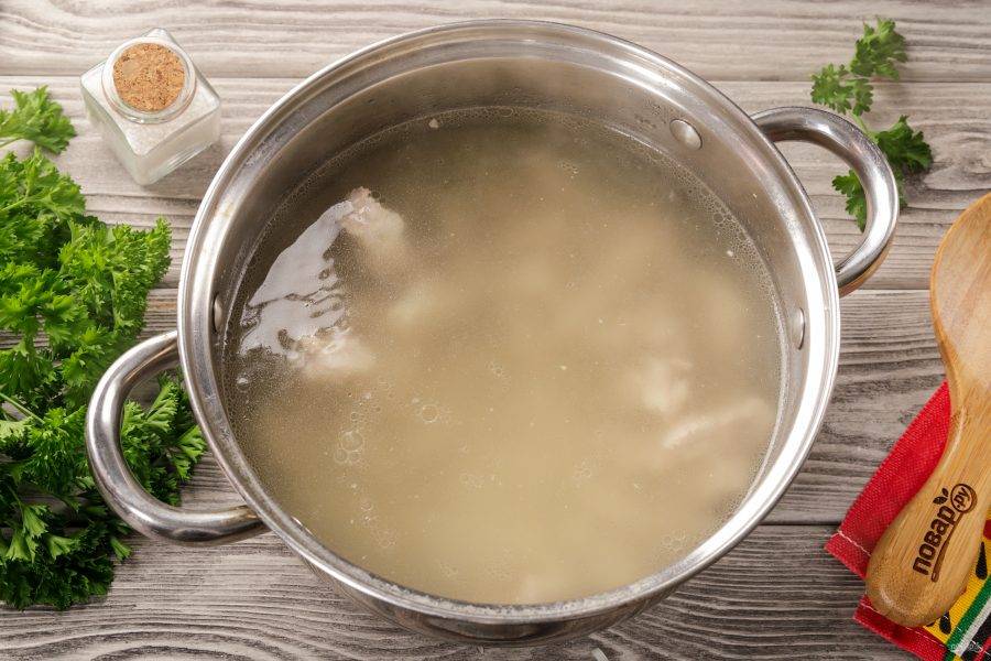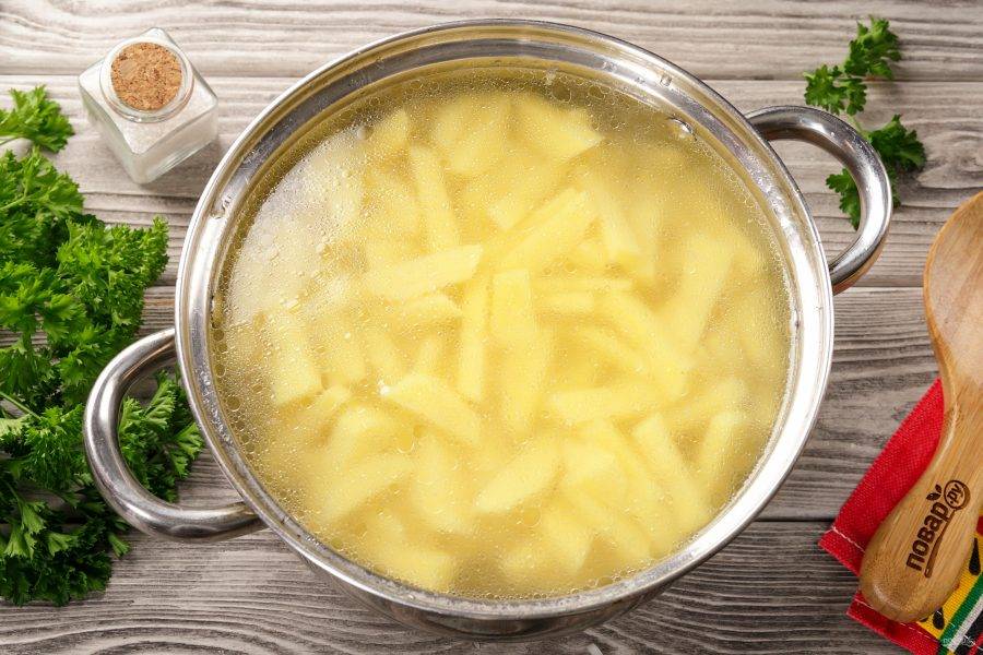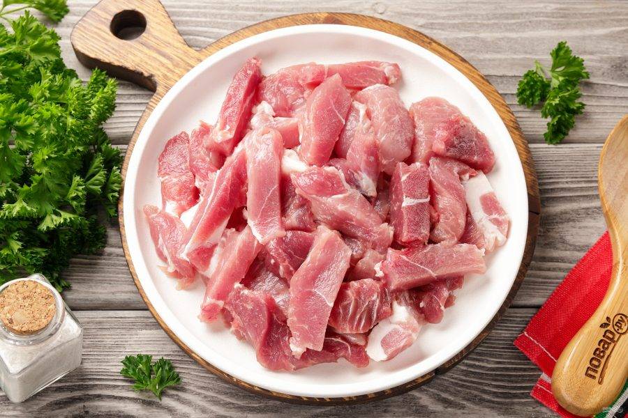 Свинину нарежьте брусочками, залейте водой и поставьте на огонь. Доведите до кипения, снимите пену и на минимальном огне варите около 40 минут.