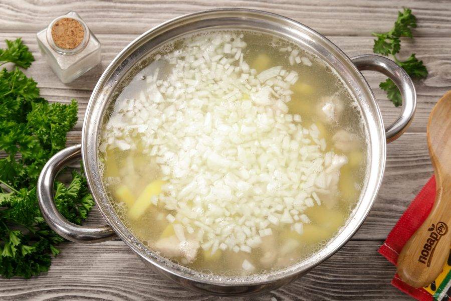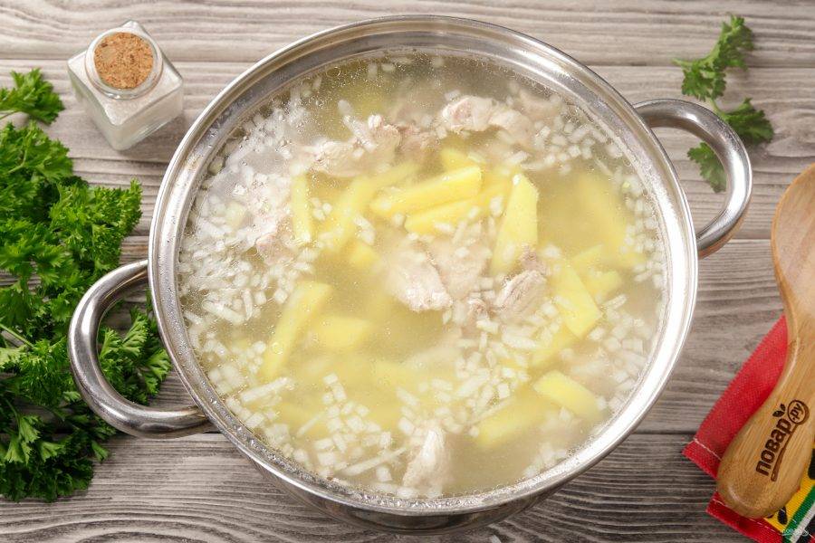 Затем добавьте лавровый лист и варите ещё 5-10 минут или до готовности картофеля.