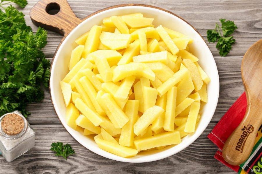 Картофель можно нарезать произвольно, но не слишком мелко, у меня брусочки.