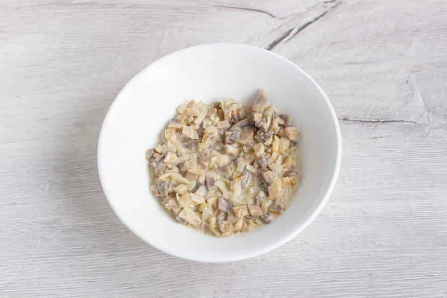 Лук и грибы мелко нарежьте. В растительном масле обжарьте лук, затем добавьте грибы и в конце приготовления одну минуту потушите со сметаной. Посолите по вкусу.