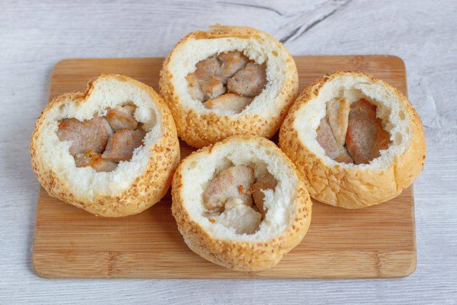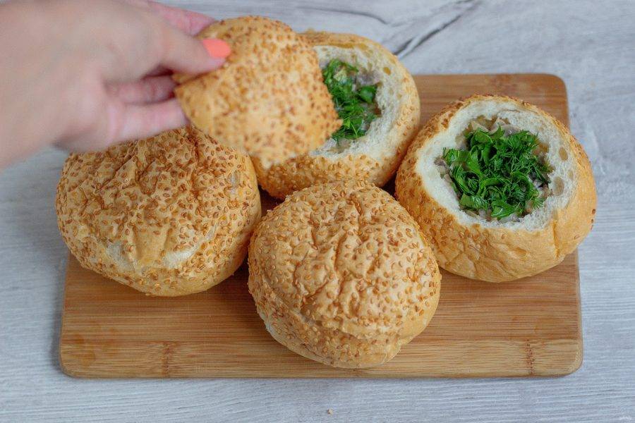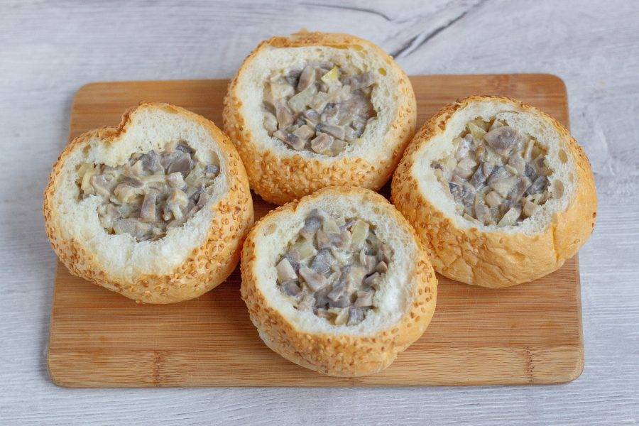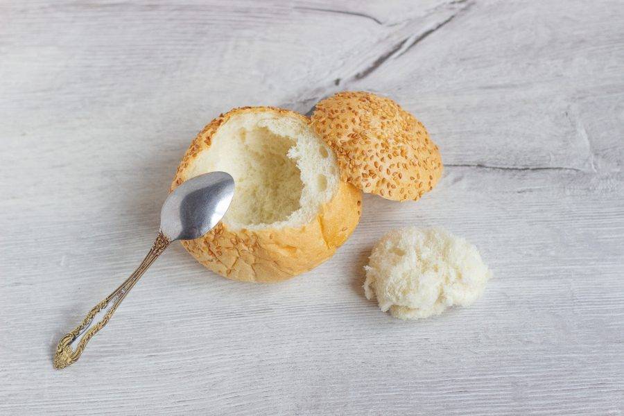 У булочек отрежьте макушку, чтобы получилась крышка, чайной ложкой достаньте мякоть булочки так, чтобы остались стенки и дно.