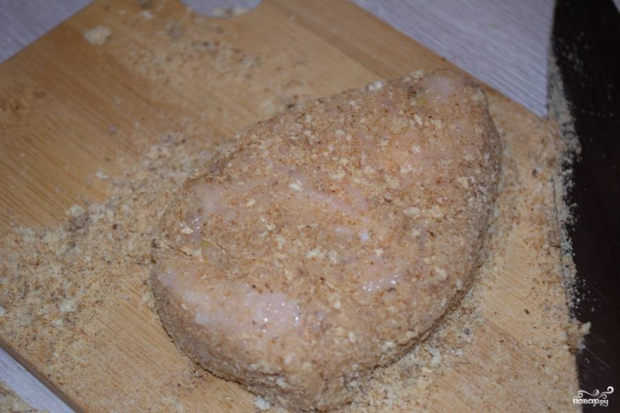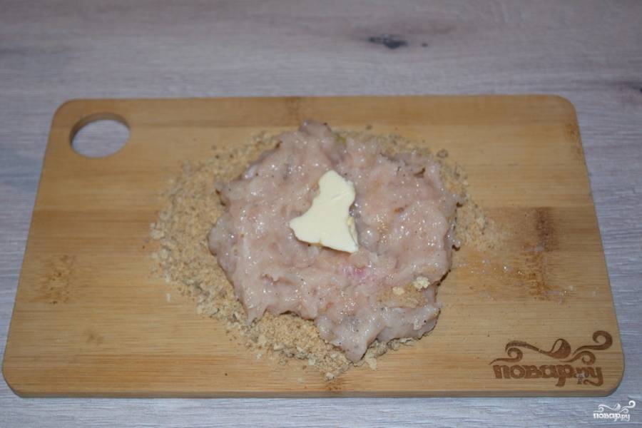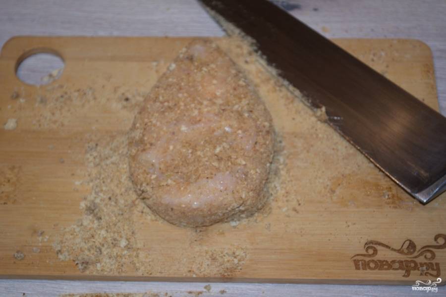 Хорошо вываляйте котлету в панировке. Помните, что котлета должна быть хорошо слеплена, чтобы масло при обжарке не вытекло.