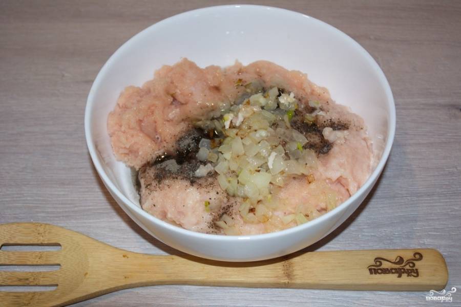 Смешайте фарш, обжаренный лук (масло нужно отжать, в фарш не добавлять). Добавьте специи по вкусу и соль.