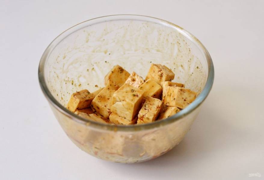 Тофу нарежьте кубиками, добавьте соус "Тамари" и специи для рыбы, перемешайте.